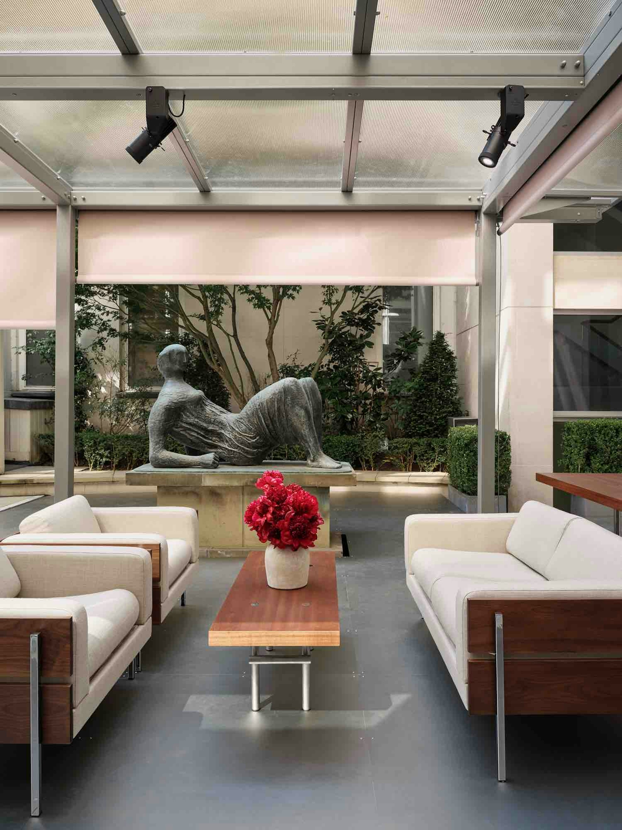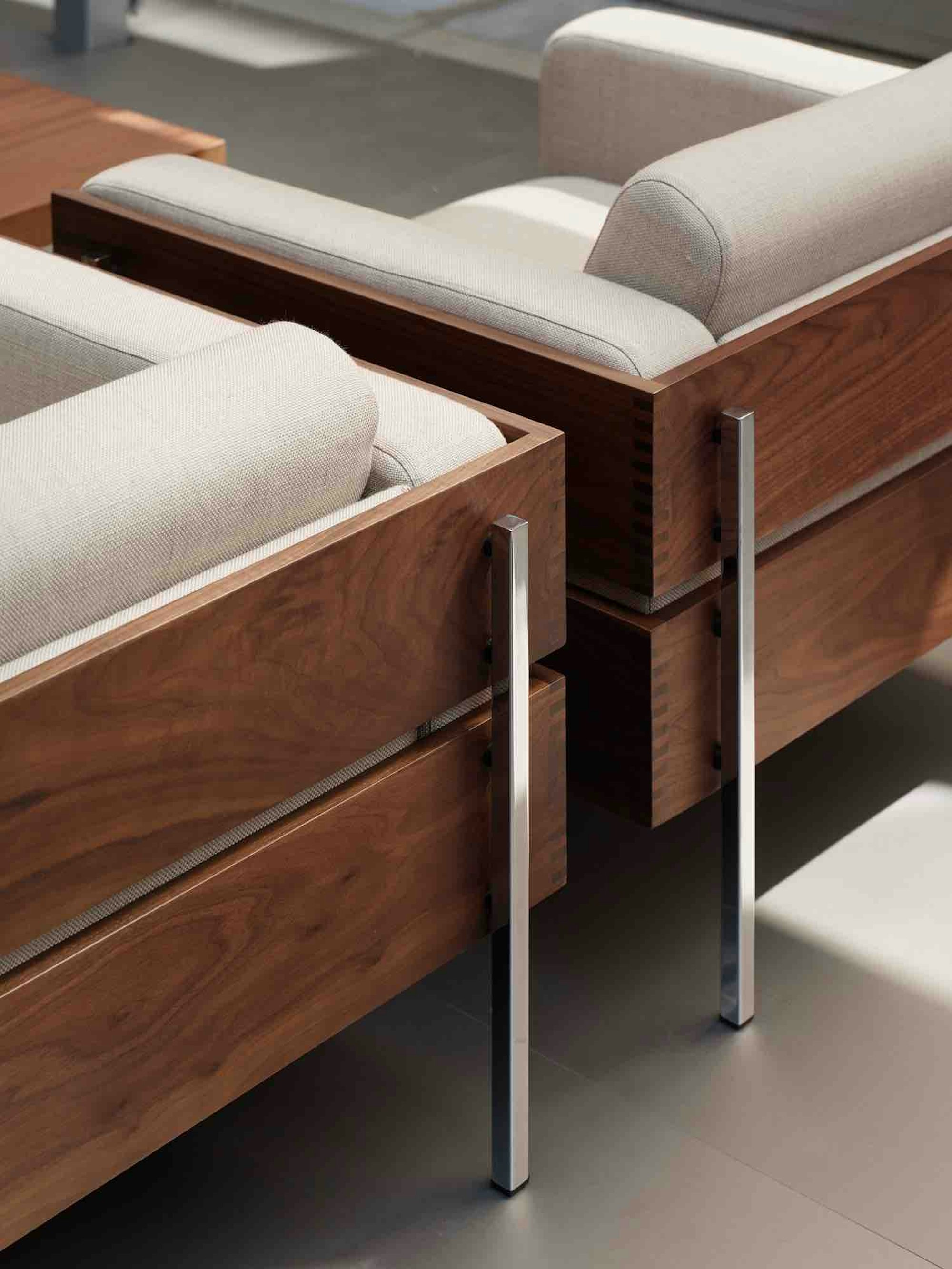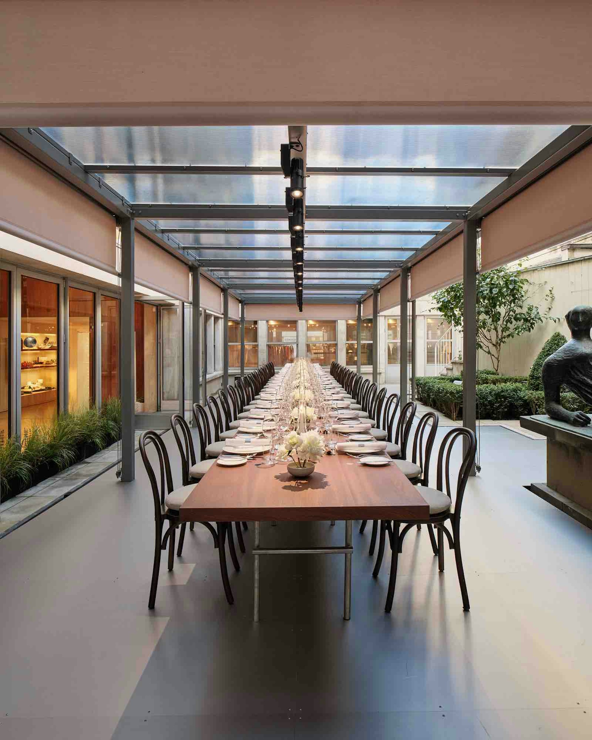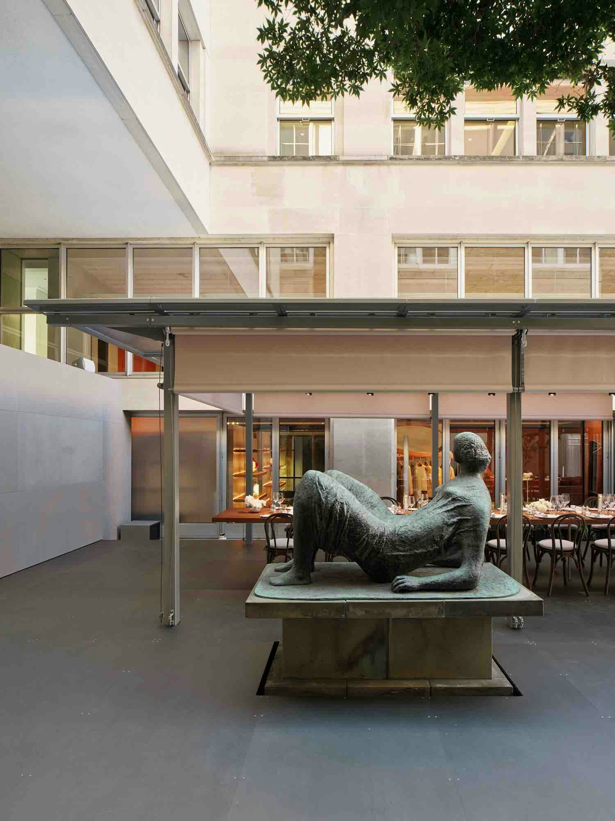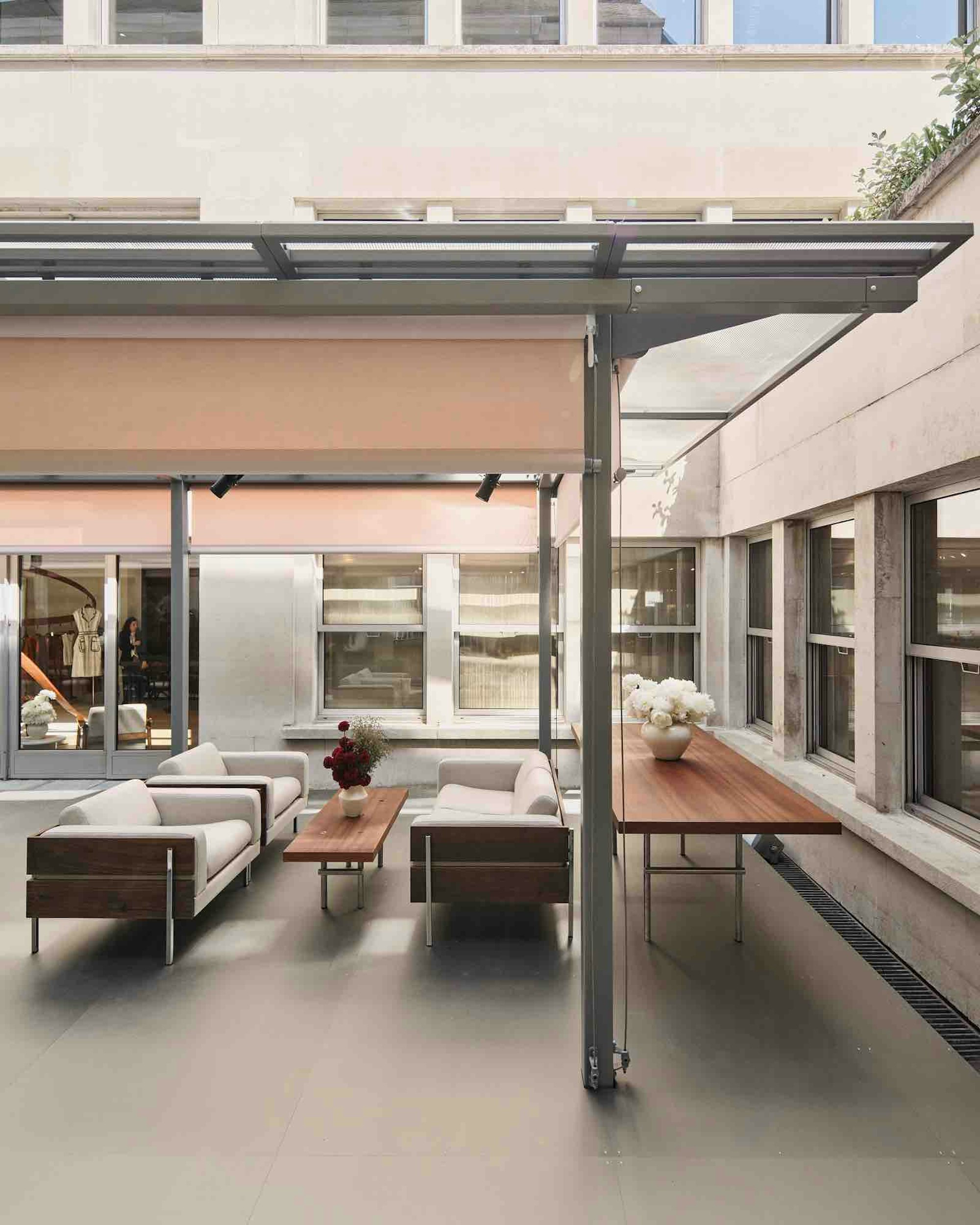 Hermès, Re Editions Pavilion, London. Designed with a refined palette of sapele, polished chrome, and British design icons, the pavilion sits quietly within the existing architecture of the Time & Life building.